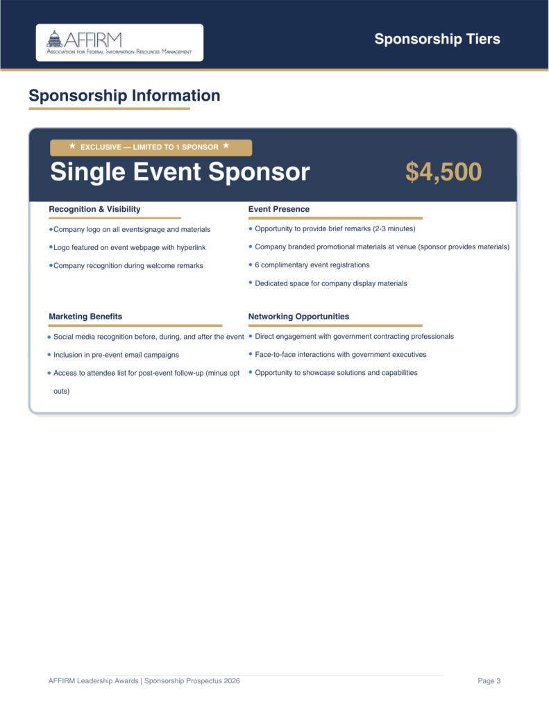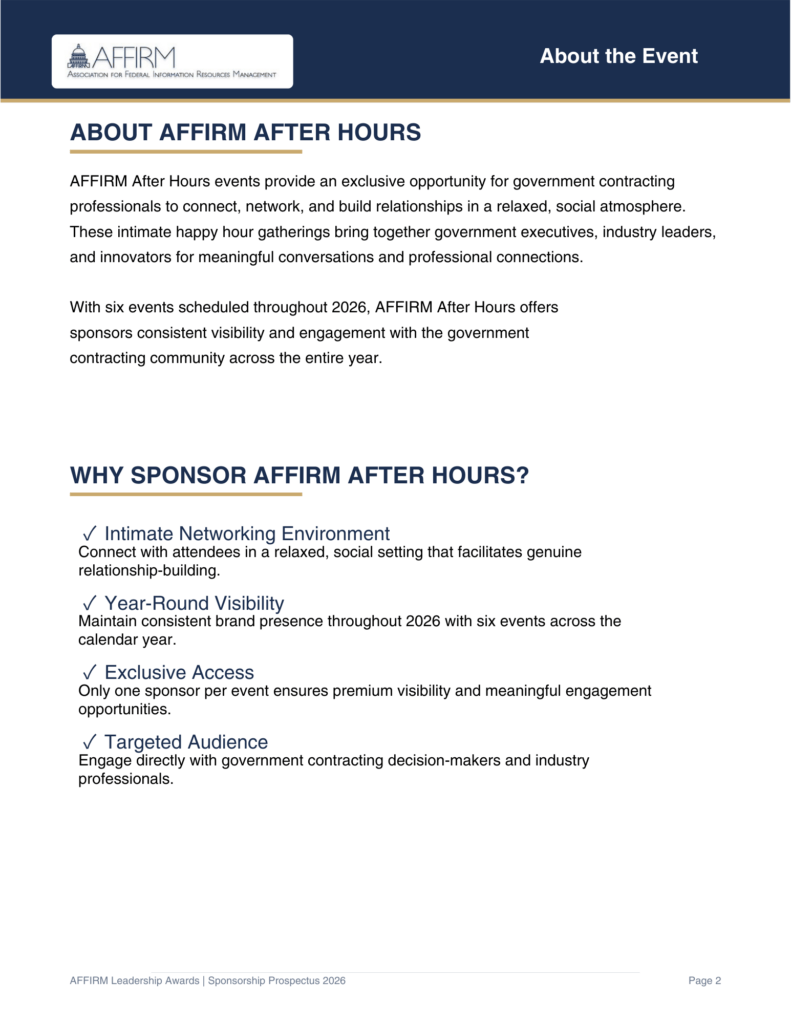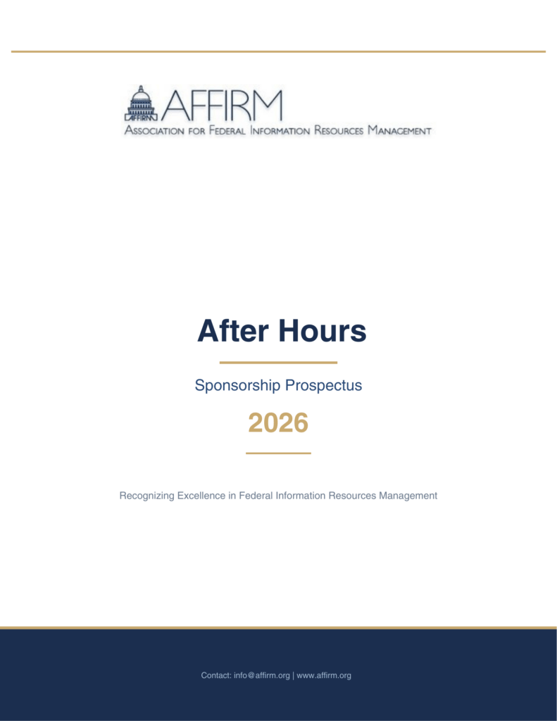 AFFIRM’s Speaker Series will run from September 2024 to June 2025. These programs feature agency CIOs and others discussing best practices and upcoming initiatives. Each program will highlight a cabinet-level agency and its departments/sub-agencies.