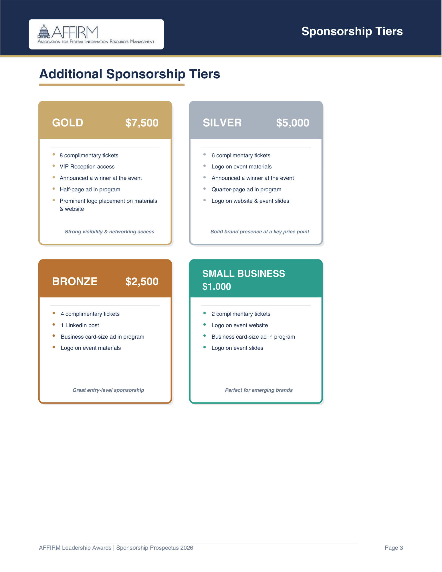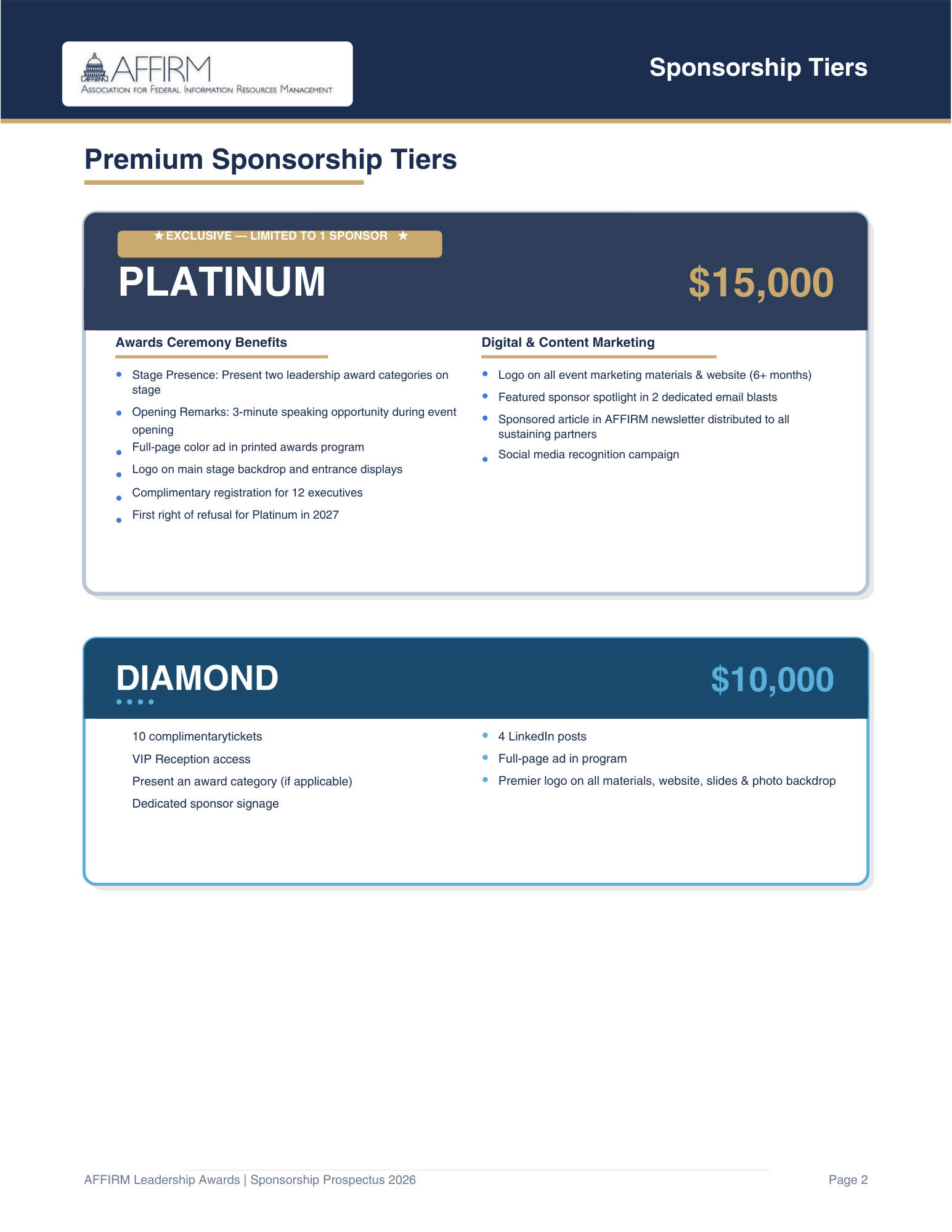 The AFFIRM Leadership Awards are among the most prestigious of the Federal community, honoring individual and team outstanding leadership from the preceding year. First awarded in 1979, award honorees join a prestigious list of agency executives and managers. Awards are for demonstrated leadership leading to successes in specific categories, ranging from IT Management to Health Information Systems, Big Data, and related areas.